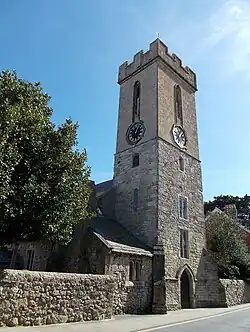 The church consists of nave with north and south aisles, a chancel and a western tower. The original church was said by local tradition to have been at the east end of the town, and its foundations were visible in the old churchyard in 1845. Destroyed by the French in their raid of 1377, it is said to have been rebuilt on the present site only to be again reduced to a ruin in 1543. At the beginning of the 17th century it was practically rebuilt, and reconsecrated by John Davenant the Bishop of Salisbury on 11 March 1626. The chancel, which had a polygonal roof with enriched bosses at the intersection of the ribs, was lengthened by 12 ft. in 1889.