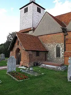 The small tower, which is 6 ft 6 in (1.98 m) square, has a timber-framed and shingled upper part, with a broach spire, which was restored in the 20th century.[1] Unusually, it is positioned at the west end of the south aisle. The lower stage is early-13th-century but the upper stage is modern. The presence of Tudor brick buttresses outside suggest that the upper portion became unsafe and was taken down.[10]