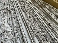 The church is noted for the south porch with its groin vaulted roof, restored carved bosses and priests chamber above. The original and almost unique 15th-century south doors of Stoke- by-Nayland church reveal a Jesse tree, carved with figures, birds and insects, exquisitely carved in oak. Other special features of the interior include the font, clearly marked with the rose en soleil badge of Edward IV and with panels of the emblems of the four Evangelists.