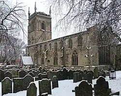 The early-12th-century church had no aisles, and various parts of these walls survive.[7] It underwent a major expansion in the 1160, with a north aisle, doorways to north and west, and an extension to the chancel. The two doorways provide external Norman zigzag decoration, but it is the sedilia and piscina in the Chancel extension that Nikolaus Pevsner describes as "the finest piece of Norman decoration in the county".[7] Thirteenth-century alterations culminated in a major reworking of transepts and south aisle, to create an aisle wider than the nave, providing much more space for local parishioners.[7] Also the huge east window of the south aisle, with ingenious tracery, was created around 1300.[7] The tower was built inside the south aisle, apparently as an afterthought, rising to a quatrefoil frieze, four decorated pinnacles, and the needlelike spire rising from the battlements.[7] The spire was rebuilt in 1783, but retained its crockets and three tiers of lucarnes.[7] The interior was worked on by George Gilbert Scott throughout the 1860s.