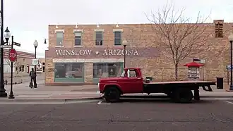 Standin' on the Corner Park is a public park in Winslow, Arizona, opened in 1999, commemorating the song "Take It Easy" which was written by Jackson Browne and Glenn Frey and most famously recorded by the Eagles. The song includes the verse "Well, I'm a-standin' on a corner in Winslow, Arizona, and such a fine sight to see. It's a girl, my Lord, in a flatbed Ford slowin' down to take a look at me." The park contains a two-story trompe-l'œil mural by John Pugh, a Ford flatbed truck, and a bronze statue by Ron Adamson[1] entitled "Easy" (which resembles Browne, but represents "the troubadour") who is standing on a corner with a guitar by his side. The park is surrounded by a wall of bricks, with windows to peer into; each brick has a donor's name on it, and a story by each of the donors describing their fondness for Winslow, Arizona.[2]
