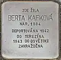 Kafková, Beila BertaBeila Berta Kafková was either born on 22 May 1883 or on 22 May 1884.[24] Her parents were Bernard Issakhar Kafka and Elenora Kafková. She was married to Max Beniamin Meir Kafka. The couple had two sons, Osvald (born 1908) and Otakar (born 1919), see above. She was a housewife. On 26 November 1942, she and her sons were deported from Klatovy to Theresienstadt concentration camp by transport Cd. Her transport number was 127 of 651. According to two serious sources she died in Theresienstadt, most probably on 13 December 1942. Therefore, the inscription on the Stolperstein, indicating that she was deported to Auschwitz in 1943 and was murdered there, might be wrong.[25][26]