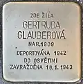 Glauberová, GertrudaGertruda Glauberová née Zinner, also called Gertrude or Trude, was born on 24 August 1909 in Hlinsko. Her parents were Ludwig Zinner and Stefanie née Bergmann, also Steffi. She had a sister named Marianna, born on 20 March 1906, later married as Kraus. She married Valtr Glauber (see above). The couple had a son, Karel, born in 1937 (see above). She was arrested, separated from her child and deported to Auschwitz concentration camp. There she was murdered on 16 January 1943.[16]