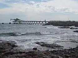 Bombo was the site of an ocean jetty for the nearby headland quarry.[10] The jetty was on the north side of Bombo Point. Bombo was more exposed to the weather than Kiama and a less reliable port as a result.[1] Stone from the quarry was crushed and then carried in rail wagons onto the wharf, where it was loaded onto ships using any of three chutes. The crushers and jetty were capable of shipping 3,000 tones of crushed stone per week in 1885.[11]