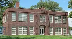A flagpole is located outside the main entrance to the school building, and is included in the NRHP listing as a contributing feature. A set of gym bars, a tether ball pole, a swing set, a "slippery slide", and a merry-go-round are located on the south and west sides of the property, and are all listed as contributing features. A fenced tennis and basketball court is located on the north side of the property, and a large track and playing field are located on the west side of the property, but none of these features are included in the listing.[2]