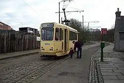 The Summerlee Transport Group (STG) was formed in 1988, in order to support the maintenance and operation of the tramway.[5] The original tramway used to terminate only 300 yards from the entrance at the timber shed, before the extension of the Gartsherrie Branch canal bridge and thence towards the Miners' Cottages. As continued tradition, the cars continued to halt at the timber shed before continuing over the bridge and around the bend.