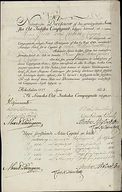 A commission to investigate the applications was appointed on 24 March 1746, and some weeks later on 14 May, they concluded that the directors from the first charter were best suited to lead the second as well.[64] However, the number of directors was increased from three to at least seven. In addition to Colin Campbell, Niclas Sahlgren and Teodor Ankarcrona, the directors were former secretary of the Executive Board Magnus Lagerström, the Stockholm merchants Anders Plomgren and Abraham Grill. These six members of the board later elected Claes Grill, Jacob von Utfall Jeanson, S. N. Wenngren and Nils Ström as directors.[65]