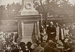 It was Elliston who proposed in 1919 that a village war memorial of stone should be erected, and this was designed by architect W.H. Wood,[33] and unveiled in 1921. He also proposed an inscribed brass war memorial tablet within the church, and this was also designed by Wood and unveiled on the same day.[34]