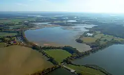 The Třeboň Basin is known for its fish ponds, which were established in the region since Middle Ages. There are the largest ponds in the Czech Republic, including Rožmberk, Horusický rybník, Dvořiště, Velký Tisý rybník and Záblatský rybník. Rožmberk Pond is the largest pond in the country and the largest fish pond in the world with surface area of 489 hectares (1,210 acres). It was built between 1584 and 1590.[4]