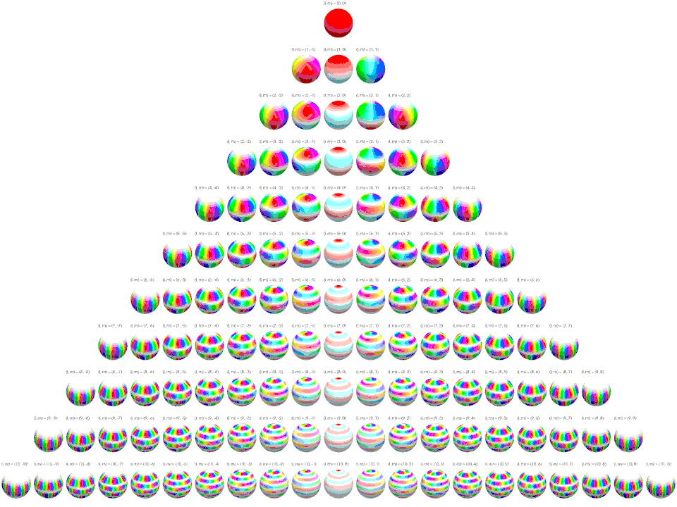 Below the complex spherical harmonics are represented on 2D plots with the azimuthal angle, , on the horizontal axis and the polar angle, , on the vertical axis. The saturation of the color at any point represents the magnitude of the spherical harmonic and the hue represents the phase.