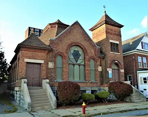 The former synagogue is a 1+12-story, rectangular, eclectic brick building which has an octagonal roof and is topped by an octagonal louvered cupola. It features two turreted towers of unequal height with pyramidal roofs and a rose window with Star of David over three round arch windows.[2][3]