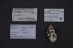 - Poupre mosaique, Purpura musiva original description in Latin and French. Louis Charles Kiener, Spécies général et iconographie des coquilles vivantes : comprenant la collection du Muséum d'histoire naturelle de Paris, la collection Lamarck, celle du Prince Masséna ... et les déecouvertes réecentes des voyageurs, tome 1, part 3, page 38. Illustration, plate 9, figure 22.