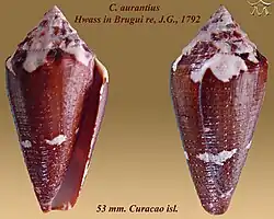 - Tenorioconus aurantius (Hwass in Bruguière, 1792): synonym of Conus aurantius Hwass in Bruguière, 1792 (alternate representation)
