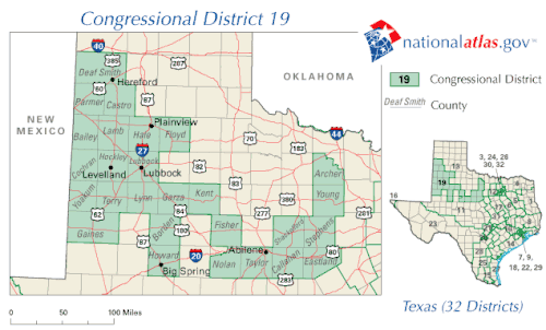 Texas's 19th congressional district of the United States House of Representatives includes the upper midwestern portion of the state of Texas. The district includes portions of the State from Lubbock to Abilene. The current Representative from the 19th district is Republican Jodey Arrington. With a Cook Partisan Voting Index rating of R+25, it is one of the most Republican districts in Texas.[4]