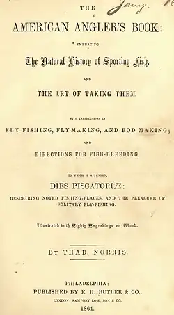 The American Angler's Book Embracing the Natural History of Sporting Fish and the Art of Taking Them with Instructions in Fly-Fishing, Fly-Making, and Rod-Making and Directions for Fish-Breeding, to which is appended Dies Piscatoriae Describing Noted Fishing-Places, and The Pleasure of Solitary Fly-Fishing is an early American angling book by Thaddeus Norris (1811-1877) first published in 1864. Norris was known as Uncle Thad and commonly referred to in American angling history as "The American Walton".[1]