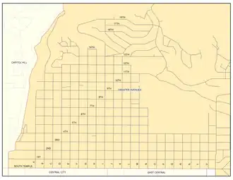 The large Salt Lake City Cemetery occupies a significant portion of the eastern Avenues below 11th Avenue and abuts Lindsey Gardens (park). To the north of 11th Avenue is the 11th Avenue Park, west of Terrace Hills, a major north-south street leading into the upper Avenues.