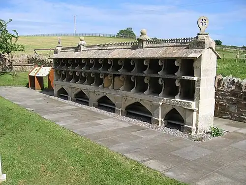 The bee shelter was originally located in Nailsworth[1] and was moved to the grounds of Hartpury College in 1968,[2] before being relocated to the churchyard of St Mary's Church in 2002.[2] Until the late 20th century, the beehive shelter was believed to date from the early 17th century and that it functioned as a beehive rack.[1] Recent research has confirmed that it was constructed in the 19th century as a bee shelter by the stonemason Paul Tuffley, a member of a prominent Gloucestershire family of masons, stone merchants and quarrymasters.[1] The date can be confirmed by the stone tooling marks on the shelter, which are "typically Victorian" and by the reference made to the shelter in a deed dating from 1852.[1]