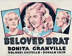 The Beloved Brat is a 1938 American comedy-drama film directed by Arthur Lubin and starring Bonita Granville, Dolores Costello, and Donald Crisp.[1] The screenplay was written by Lawrence Kimble from an original story by Jean Negulesco.