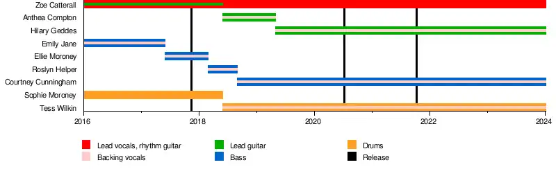 • Zoe Catterall – lead vocals, rhythm guitar (2016–present), lead guitar (2016–2018)