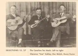 The Carolina Tar Heels was an American old time string band. It originally consisted of Dock Walsh (July 23, 1901 โ€“ May 28, 1967) on banjo and Gwen Foster on harmonica.[1] Later Clarence Ashley (September 29, 1895 โ€“ June 2, 1967) joined on guitar and Garley Foster (January 10, 1905 โ€“ October 5, 1968) would replace Gwen on harmonica. Despite sharing a surname Gwen and Garley were not related.[2]