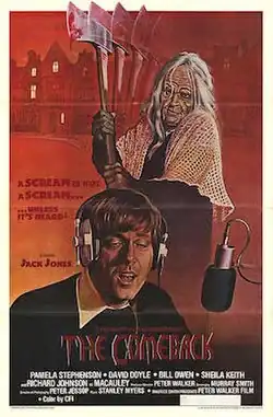 The Comeback (also known as The Day the Screaming Stopped or Encore) is a 1978 British psychological horror slasher film[1] directed and produced by Pete Walker and starring Jack Jones, Pamela Stephenson, and David Doyle.[2] Its plot follows Nick Cooper, a successful but dormant American singer who retreats to a remote manor in Surrey to record an album; there, he is followed by a psychopath—donning a hag mask—who murdered his ex-wife Gail.