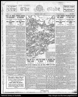 The Globe was first published on 5 April 1911 and continued under this masthead until 17 October 1914, which was its 185th issue. In these years it was published by Alfred Herbert Howard Aldworth for the "Sunday times" Newspaper Co. Ltd.[1] The newspaper then became known, on 24 October 1914, as The Globe and Sunday Times War Pictorial. Hugh Donald McIntosh took over publishing. On 6 November 2016 the title reverted to The Globe until its last issue on 25 June 1917 (issue no. 328).[2] In 1917, The Globe and Sunday Times War Pictorial merged with The Mirror of Australia to form The Mirror whose first publication was 30 June 1917.[3]