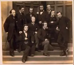 Group portrait taken c.1870 on the steps of St Salvators Quad of the Kensington Club, from the University of St Andrews' photographic archive.