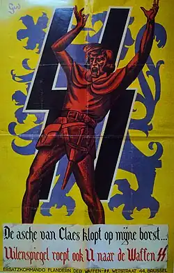 Propaganda poster of the 27th SS Volunteer Division Langemarck: "The ashes of Claes beat on my chest ... Ulenspiegel also calls you to the Waffen-SS!"