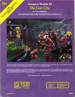 The Lost City (B4) is a Dungeons & Dragons adventure module by Tom Moldvay.[1] It was first published by TSR in 1982 and was designed as a stand-alone adventure for use with the Dungeons & Dragons Basic Set. The working title for the module was "The Lost City of Cynidicea".[2] Moldvay designed the module as a low-level scenario to give novice Dungeon Masters experience in fleshing out adventures such that it is only partially complete. The plot involves the player characters discovering a ruined subterranean city slowly rising out of the sands.[3] The adventure is set inside a huge step pyramid, with the lower pyramid only sketched out and the city itself described with a list of the major areas and a map. The adventure's main villain is Zargon, a giant one-eyed monster and his minions. The entire double pyramid, not including the city, contains over 100 rooms.