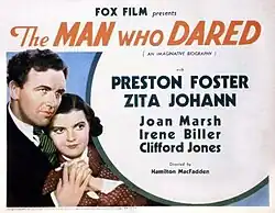 The Man Who Dared is a 1933 American pre-Code drama film directed by Hamilton MacFadden and written by Dudley Nichols and Lamar Trotti. The film stars Preston Foster, Zita Johann, Joan Marsh, Phillip Trent, and June Lang. The film was released on June 30, 1933, by Fox Film Corporation.[1][2][3] Jan Novak is based on Anton Cermak, the Chicago mayor killed in an assassination attempt on Franklin D. Roosevelt in 1933.