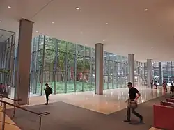 From 2007 to 2024,[84] the ground-floor lobby had an art installation called Moveable Type, created by artist Ben Rubin and statistics professor Mark Hansen.[23][85][86] The work consists of 280 small electronic screens arranged on either of the lobby's two walls, or 560 total. The screens on each wall are arranged in a grid measuring 53 by 5 feet (16.2 by 1.5 m), with forty columns and seven rows.[23] They display fragments from both the Times's archives and current news stories.[86][87] The lobby is supported by exposed intumescent beams and contains oak floors and full-height glass windows.[68] Also inside the podium is The Times Center, which includes a 378-seat auditorium for events.[56][87][88] The Times Center also includes a 5,000-square-foot (460 m2) meeting space.[88]