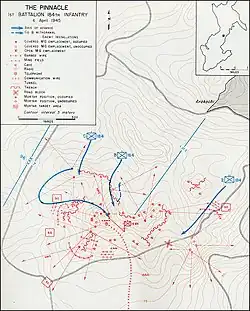The Pinnacle was the name given to a 30-foot-tall (9.1 m) spire, atop a 450-foot-tall (140 m) ridge of coral approximately 1,000 yards (910 m) southwest of Arakachi, Okinawa.[1]: 107  Heavily fortified by the 62nd Division, this outpost to Japan's main defenses at Shuri held up the U.S. 7th Infantry Division on 5–6 April 1945 with accurate and well-concealed machine gun, mortar and artillery fire.