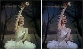 Unlike in conventional filmed theatrical ballet, the ballet sequence in The Red Shoes is not one continuous, static shot, but instead employs a variety of editing techniques, close-ups, and special effects.[15] As the ballet progresses, McLean notes that the action of the sequence "rockets from stage right to stage left, a series of swiftly performed vignettes alternating with garishly decorated set pieces. Then, as Robert Helpmann, playing the girl's lover, is borne away into the distance by a crowd, leaving the girl alone in her cursed red shoes, the action reverses... into and through the ballerina's subconscious mind."[16] Because of its dynamic nature and excessive use of cinematic techniques, McLean contests that the ballet sequence is a "greater, or more characteristic, film experience than a dance one."[17]