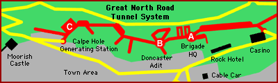 Map of the Great North Road tunnel depicting the Rock Hotel – A Brigade Headquarters B Doncaster Adit C Calpe Hole Generating Station. (North is to the left)