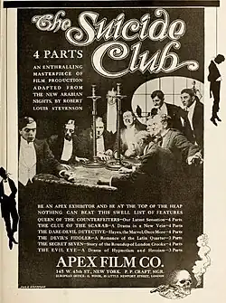 The Suicide Club is a 1914 British silent drama film directed by Maurice Elvey and starring Montagu Love, Elisabeth Risdon, and Fred Groves.[1] It was based on the 1878 short story cycle of the same name by Robert Louis Stevenson.