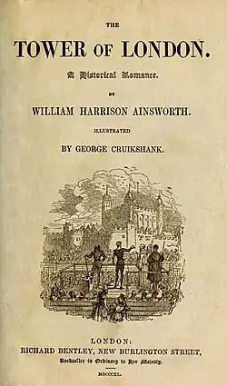 During 1840, Ainsworth was busy writing the serial The Tower of London while writing a serial for Guy Fawkes and while planning to start his own magazine. Both novels began their publication in January 1840, with The Tower of London being published on its own until December 1840. Ainsworth celebrated the conclusions of The Tower of London with a large dinner party near the printers of his works, Bradbury and Evans, at the Sussex Hotel. The work was illustrated by George Cruikshank.[1]