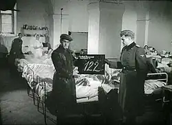 Preparations for a second Theresienstadt film, again sponsored by Günther rather than Goebbels, began concurrently with the "beautification" of the ghetto prior to the Red Cross visit.[11] Günther's Central Office, which was funded by stolen Jewish property, paid a Czech company, Aktualita, 350,000 Czech koruna (35,000 Reichsmarks) to produce the film.[12] In December 1943, a prisoner, probably Jindřich Weil, was ordered to write a script, and he finished two drafts by March.[11][13][b] On 20 January 1944, the Nazis filmed the arrival of a transport of Danish Jews and a welcome speech by Paul Eppstein, with a view of including it in a later film.[14][15][13] There was no effort to complete the film before the Red Cross visit and screen it to the guests.[11] Karel Margry, a Dutch historian who has studied the Theresienstadt propaganda films, argues that the "beautification" efforts had a higher priority, and that the propaganda would be more effective if filmed after the ghetto had been beautified.[14]