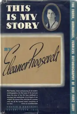 Eleanor wrote This Is My Story in 1936.[2] The book was published in 1937 by Harper & Brothers. The first edition was 365 pages.[3] It was an autobiographical account of Eleanor's life to shortly before Franklin's involvement in Al Smith's campaign for governor of New York in 1924.[1][4][5] It was Eleanor's first autobiographical work to be published.[6] The book was serialized in the Ladies' Home Journal, which she had previously written for. The editors of the journal paid $75,000 for the rights.[7] Publication in the Journal and the book were both very successful[8]—the book's first installment in the Ladies Home Journal sold 250,000 copies. The editors of the journal wrote that they made "the exciting discover that Eleanor Roosevelt's autobiography was read, in effect, by everyone—in government, parlors, and slums."[9] That year, Eleanor made $75,000 (equivalent to $1,640,451 in 2024), in part from the book (and also from speaking and publishing other works), which was more than her husband.[8]