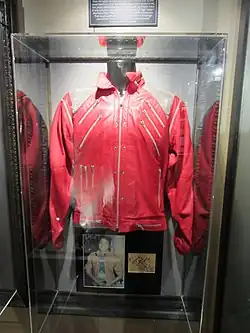 The cover for Thriller features Jackson in a white suit that belonged to photographer Dick Zimmerman. The gatefold sleeve reveals a tiger cub at Jackson's leg, which, according to Zimmerman, Jackson kept away from his face, fearing he would be scratched.[38] Another picture from the shoot, with Jackson embracing the cub, was used for the 2001 special edition of Thriller.[39]