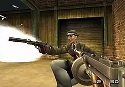 TimeSplitters 2 is a first-person shooter that requires players to kill enemies and complete objectives using a variety of weapons and tactics in different predefined scenarios. Armour and health bars on the sides of the screen lower when the player is shot, which can be increased by walking over body armor and first aid kits.