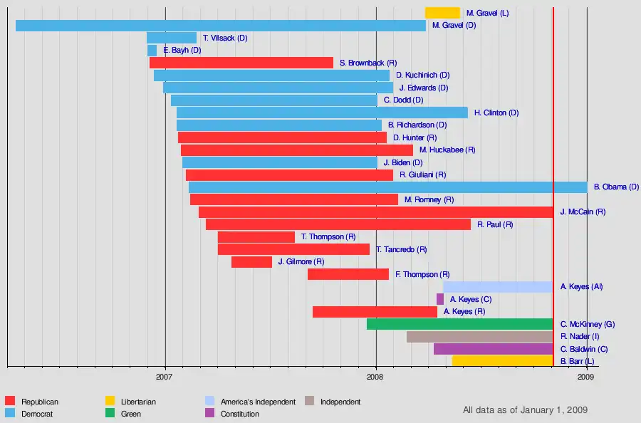 Bob Barr 2008 presidential campaignChuck Baldwin 2008 presidential campaignRalph Nader 2008 presidential campaignCynthia McKinney 2008 presidential campaignFred Thompson 2008 presidential campaignJim Gilmore 2008 presidential campaignTom Tancredo 2008 presidential campaignTommy Thompson 2008 presidential campaignRon Paul 2008 presidential campaignJohn McCain 2008 presidential campaignMitt Romney 2008 presidential campaignBarack Obama 2008 presidential campaignRudy Giuliani 2008 presidential campaignJoe Biden 2008 presidential campaignMike Huckabee 2008 presidential campaignDuncan Hunter 2008 presidential campaignBill Richardson 2008 presidential campaignHillary Clinton 2008 presidential campaignChris Dodd 2008 presidential campaignJohn Edwards 2008 presidential campaignDennis Kucinich 2008 presidential campaignEvan Bayh 2008 presidential campaignTom Vilsack 2008 presidential campaignMike Gravel 2008 presidential campaignMike Gravel 2008 presidential campaign