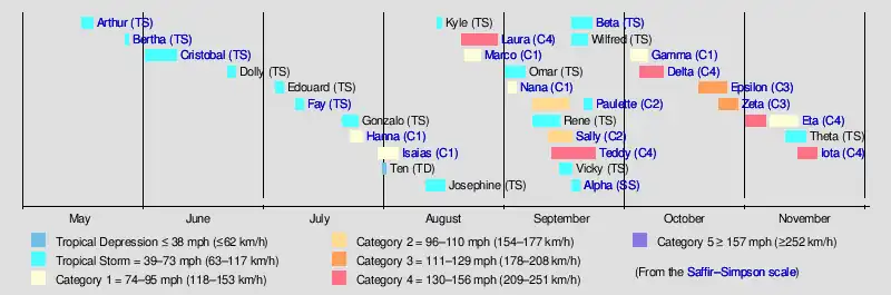 Hurricane IotaHurricane EtaHurricane ZetaHurricane Epsilon (2020)Hurricane DeltaHurricane GammaTropical Storm Beta (2020)Subtropical Storm Alpha (2020)Hurricane TeddyHurricane SallyHurricane PauletteHurricane Nana (2020)Hurricane Marco (2020)Hurricane LauraHurricane IsaiasHurricane Hanna (2020)Tropical Storm Fay (2020)Tropical storms Amanda and CristobalTropical Storm Bertha (2020)Tropical Storm Arthur (2020)Saffir–Simpson scale