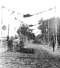On Thursday, 8 July 1869, the horse-drawn tramway began operations, following cities like New York City (1832), Montbrison (1839), Paris (1855), Boston (1856), Mexico City (1857), Havana and Santiago de Chile (1858), Rio de Janeiro (1859), Birkenhead (1860), London, Sydney, and Toronto (1861), Geneva (1862), Buenos Aires, Alexandria, Cape Town, Copenhagen, Saint Petersburg, and Valparaíso (1863), Berlin and Vienna (1865), Hamburg and Pest (1866), Buda and Stuttgart (1868), and Brussels (May 1869), Temesvár, with 32,725 inhabitants, was among the first cities worldwide to open a horse-drawn tramway. Like most cities, Timișoara used standard gauge, except for Santiago de Chile, Rio de Janeiro, and Valparaíso (colonial gauge, 1676 mm) and Saint Petersburg (Russian broad gauge, 1524 mm).[3]