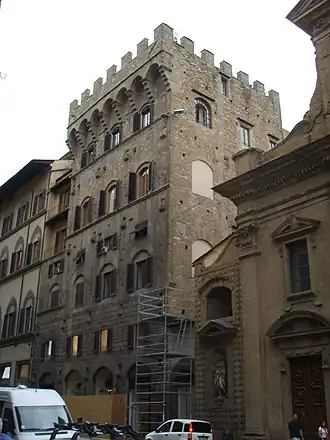 The Torre dei Gianfigliazzi is a Romanesque-style medieval tower-residence located on Via de' Tornabuoni #1 in central Florence, region of Tuscany, Italy. It can be seen rising adjacent to the left of the church of Santa Trinita. It now hosts a hotel.