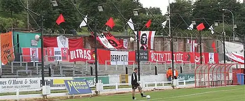 By Irish footballing standards, Derry City have a relatively large and deeply loyal fan-base. Upon the club's entry into the League of Ireland in 1985, crowds of 10,000 regularly flocked to the Brandywell to see their team. The "red and white army", as they are known in reference to the club's red and white colours, are regarded as being one of the largest, noisiest and most colourful groups following a team in the League of Ireland.[1][2] Derry's average home attendance of 3,127 was the highest of any league team for the 2006 season and they are known to bring substantial numbers to away games, despite their isolation in the north-west. Furthermore, the highest attendance in the Premier Division was the last-night-of-the-season meeting between Derry City and Cork City FC at the Brandywell on Friday 17 November when 6,080 watched Derry exact some measure of revenge for their defeat in the reverse of the fixture the season before (which incidentally was also the highest attendance in 2005). Derry's supporters gave their team remarkable support in the club's UEFA Cup run during the 2006 season – around 3,000 travelled to Motherwell to see Derry beat Gretna FC 5–1 in Fir Park, while over 2,000 made their way to Paris to see their team play PSG in the Parc des Princes. Fans often use the high vantage point of the City Cemetery in Creggan to view games for which they have failed to source tickets or simply to view the games at a distance for free.[3][4]