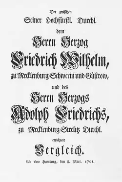 The Treaty of Hamburg (German - Hamburger Vergleich or Hamburger Erbvergleich) was a dynastic house law of the House of Mecklenburg. Heavily influenced by representatives of the Lower Saxon Circle, it was agreed on 8 March 1701 in neutral Hamburg. It ended the dispute over the inheritance of the Mecklenburg-Güstrow caused by the death of Gustav Adolph, Duke of Mecklenburg-Güstrow without a male successor in 1695 and established the duchies of Mecklenburg-Strelitz and Mecklenburg-Schwerin.