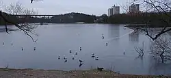 Along the shores of the lake is a park created on a flat terrain. Leading up to Nybohov on the southern side of the lake is a fault bluff with pines and deciduous trees, including hazel. On the eastern shore is a bathe next to the Liljeholmen metro station, a bus terminal, the light rail Tvärbanan, newly added flats, and some older buildings. Several residential areas surround the lake, including Gröndal.[4]