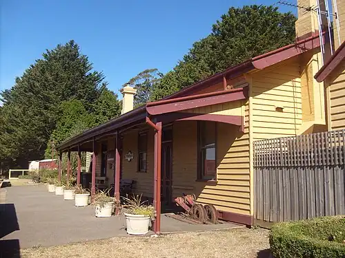 Since the closure of the line, the station building, platform and goods shed, and a short section of track, have all been retained. Tenants live at the station and look after it as a museum. The rail track still exists for 1 km on either side of the station, and some rolling stock has been put on display in the former station yard. Although the rest of the track has been removed, the railway reserve is still zoned for railway use, and the Daylesford Spa Country Railway has plans to restore the track to Trentham from its current terminus at Bullarto.[3]