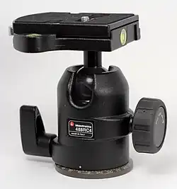 A ball head, showing panoramic rotation lock lever, and ball lock knob.