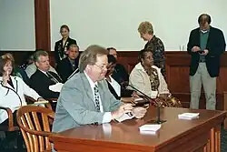 In May 1997, Brown was seeking reelection to the board of education when she was attacked by several right-wing Christian groups for her sexual orientation and for voting in favor of the policy.[10] A flyer titled "Take a Hike Dyke" was circulated throughout the community, urging voters to not vote for Brown because of her sexual orientation.[13] Additionally, a religious decree was issued by the self-proclaimed Wayne County "Bible Court" comparing electing Brown to the position to hiring an "alcoholic to drive a school bus or a pedophile to work in a day care center".[14][15]